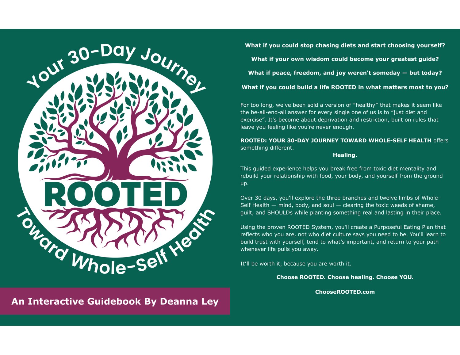 “If you’re tired of the countless efforts to live someone else’s plan, please come home to ROOTED. Rooted is about finding, nurturing, and growing what works for your body, mind, and soul — your whole wonderful self.”